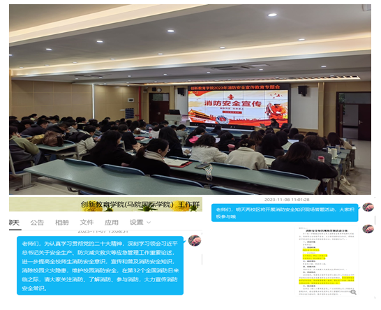在第32个全国消防日到来之际,公司通过线上工作群发放相关宣传资料,线下召开消防安全宣传教育专题会普及消防安全知识,强化教职工消防安全意识。此外,还进行了消防安全检查。对学院所涉及的办公实训场所的水、电、门窗等进行了安全排查,对学院教职工非机动车辆未按规定停放的进行了提醒和告诫。